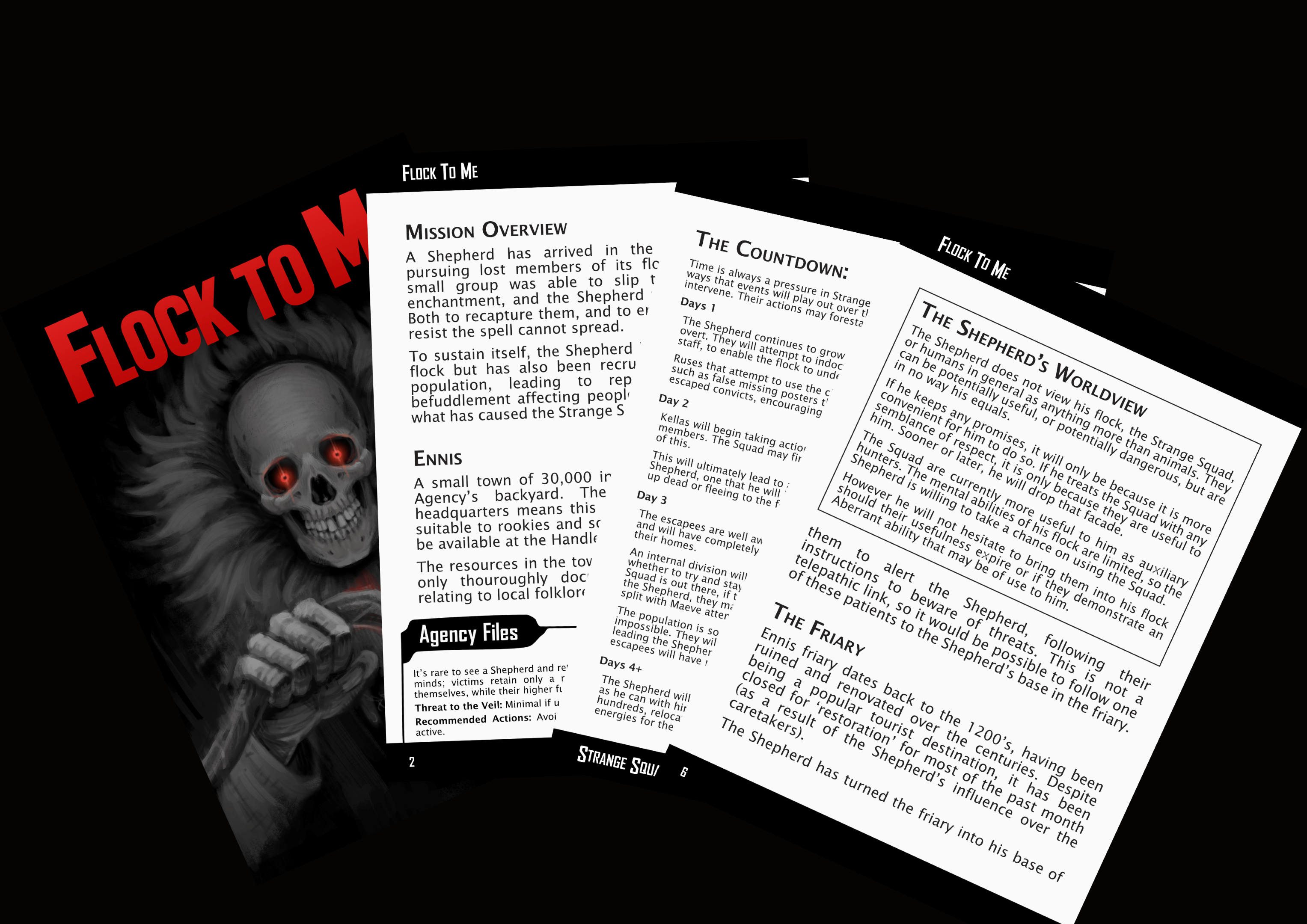 Flock to Me is a paranormal adventure for Monster of the Week and Strange Squad, bringing you into the mystery that plagues the small city of Ennis in rural Ireland.